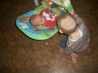 Other Emilia news includes lots of smiles, coos, laughs, and her newest stunt... the rollover! She is now able to roll from her belly to her side, and even to her back when she is mad enough. It means that I have to come up with creative things for tummy time, as she HATES being on her tummy. She is still the easiest baby I have ever cared for. She sleeps through the night (six hours or so at a time) Only cries when she wants something, and is in general a happy baby most of the time. Truly blessed. Duncan is starting to get into the jealous aspects of big brotherhood. He can't stand us holding her without him being in our lap as well. He is starting to enjoy her a little more though. Still kinda rough with her, but it is getting easier the more she smiles at him.